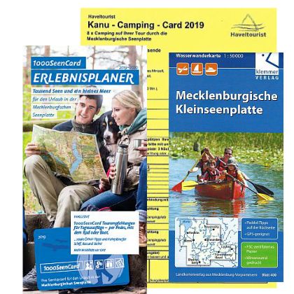 Was das ist? Wir haben Dir ein tolles Paket für Deinen Campingurlaub geschnürt - die Haveltourist-Camping-Card mit dem 1000SeenCard-Erlebnisplaner und der Wasserwanderkarte für die Mecklenburgische Kleinseenplatte vom Klemmer-Verlag. Damit kannst Du ziemlich spontan und kostengünstig in der Kleinseenplatte unterwegs sein. Du brauchst noch Dein Mini-Zelt, Dein Kanu oder Kajak und schon kann es losgehen.